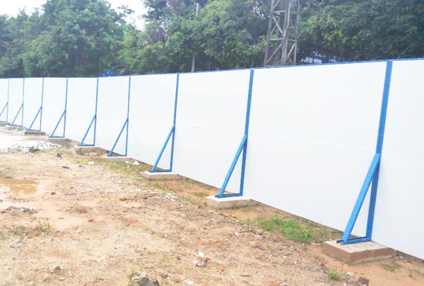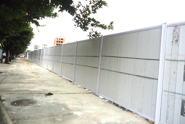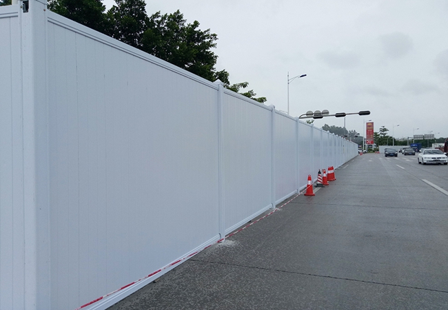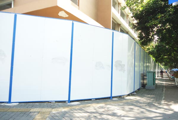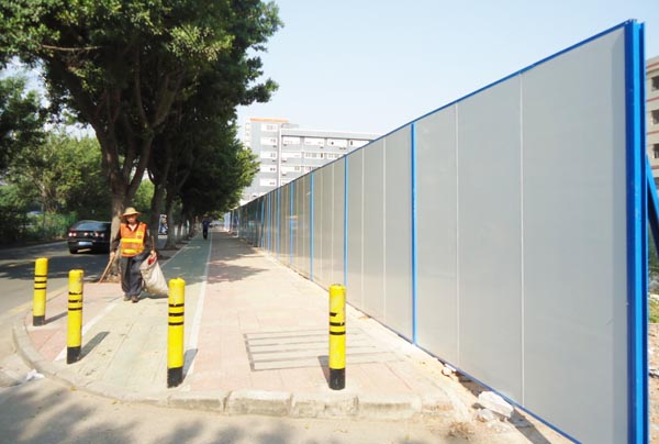 施工圍擋用白色彩鋼板作墻體,用藍色雙拼C型鋼作立柱,立柱頂部配藍色造型端蓋(可裝路燈),圍墻四周用藍色彩鋼框邊。高矮、大小、色澤一致。臟污后隨時可用水清洗擦拭。