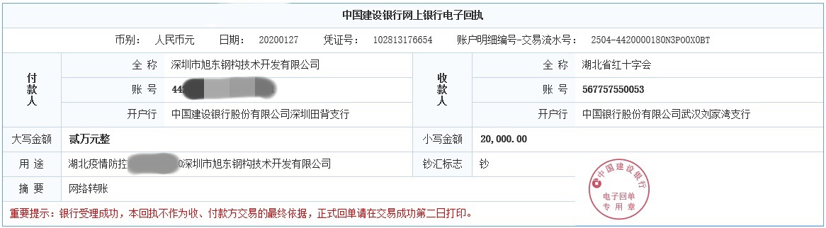 深圳市旭東鋼構技術開發有限公司也毫不猶豫,主動承擔社會責任,奉獻出自己的一份力量,2020年1月27日向湖北省紅十字會捐贈兩萬人民幣,展現了公司的社會責任感和企業的一份愛心。