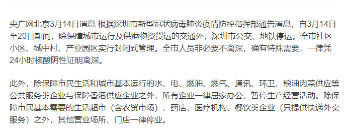 自3月14日深圳市政府宣布為了疫情防控,除保障城市運(yùn)行及供港物資貨運(yùn)的交通外,全市公交、地鐵停運(yùn)。全市社區(qū)小區(qū)、城中村、產(chǎn)業(yè)園區(qū)實(shí)行封閉式管理。全市人員非必要不離深,確有特殊需要,一律憑24小時(shí)核酸陰性證明離深。